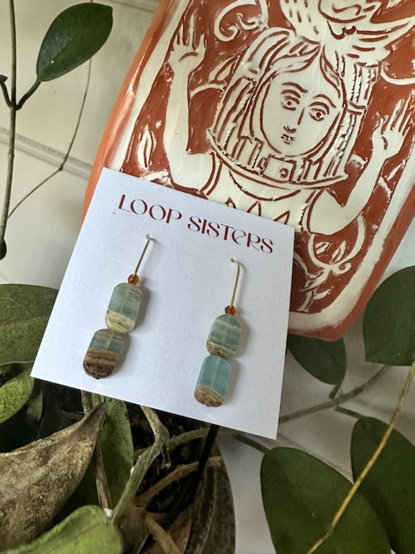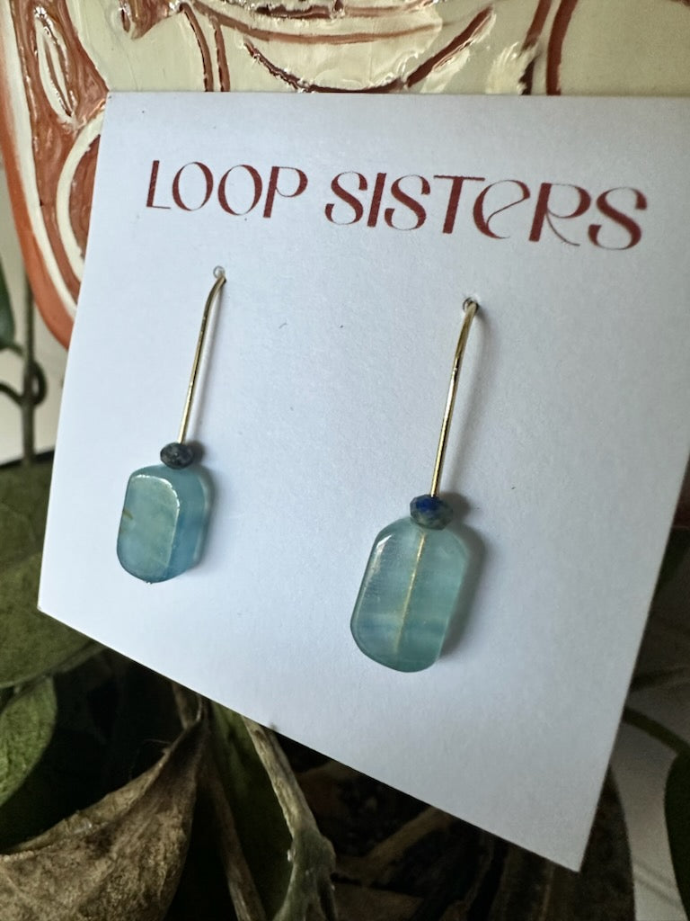 Blue Calcite (Aquatine) earrings, in a single blue topped with lapis beads or double striped drop