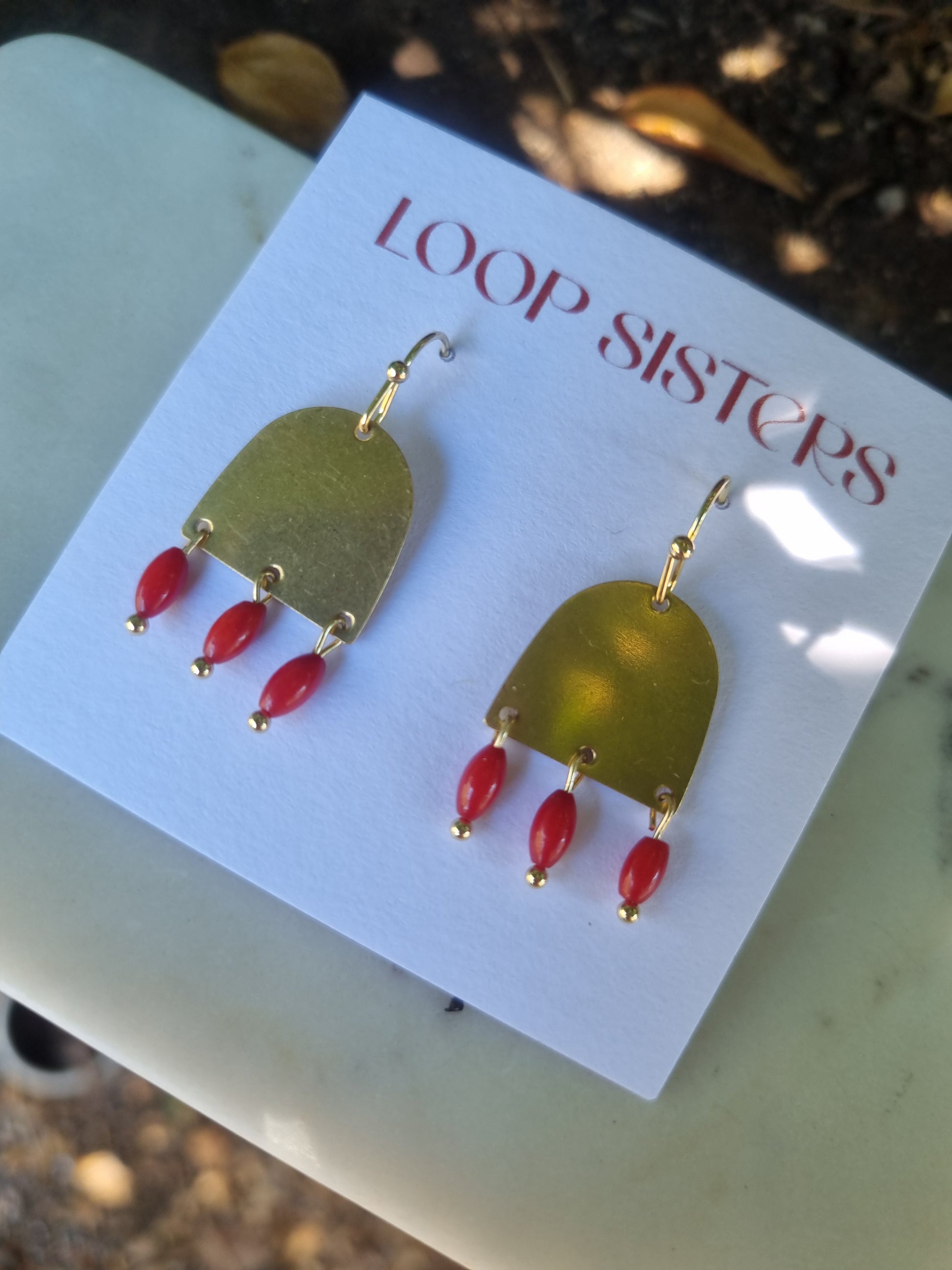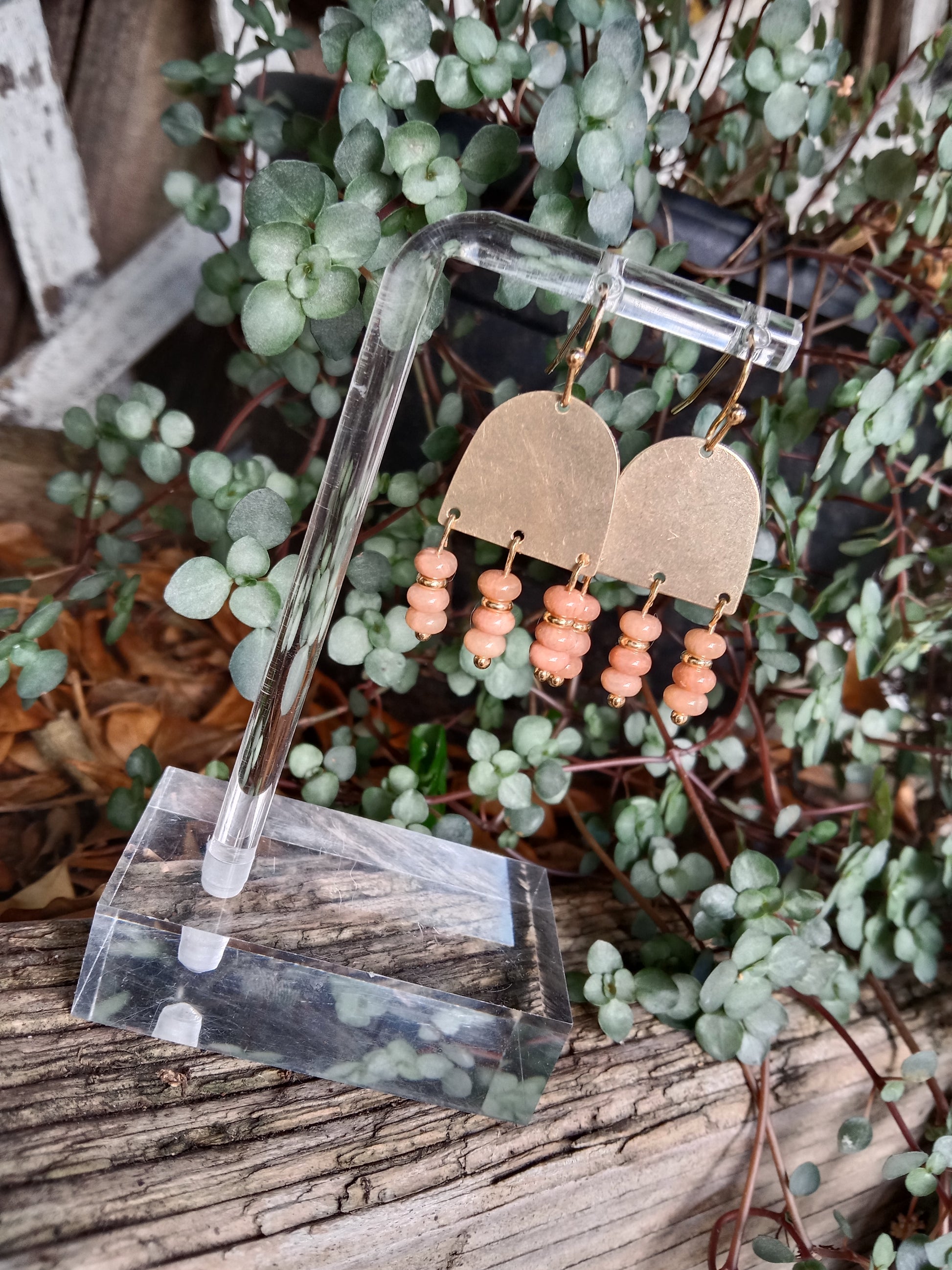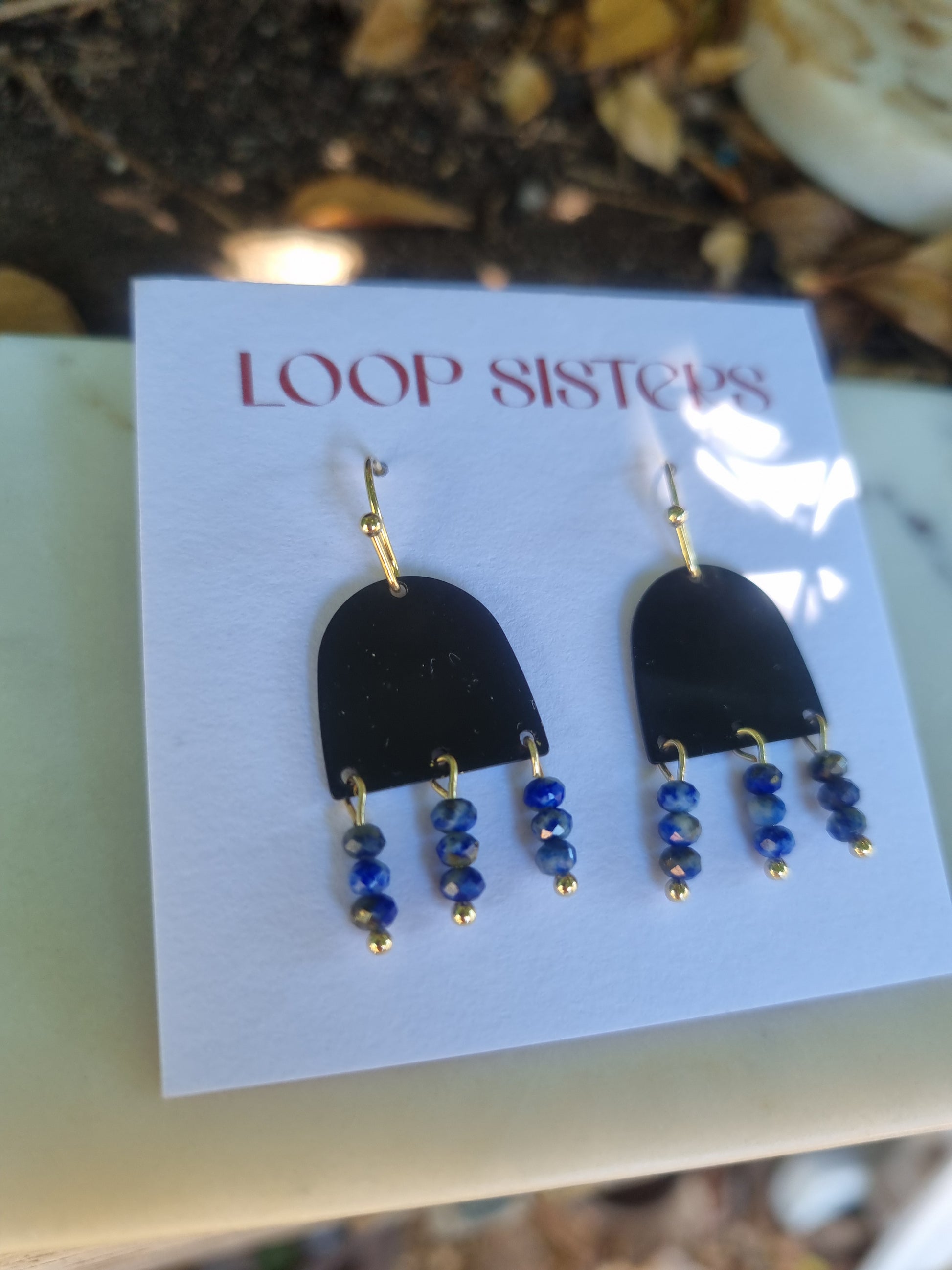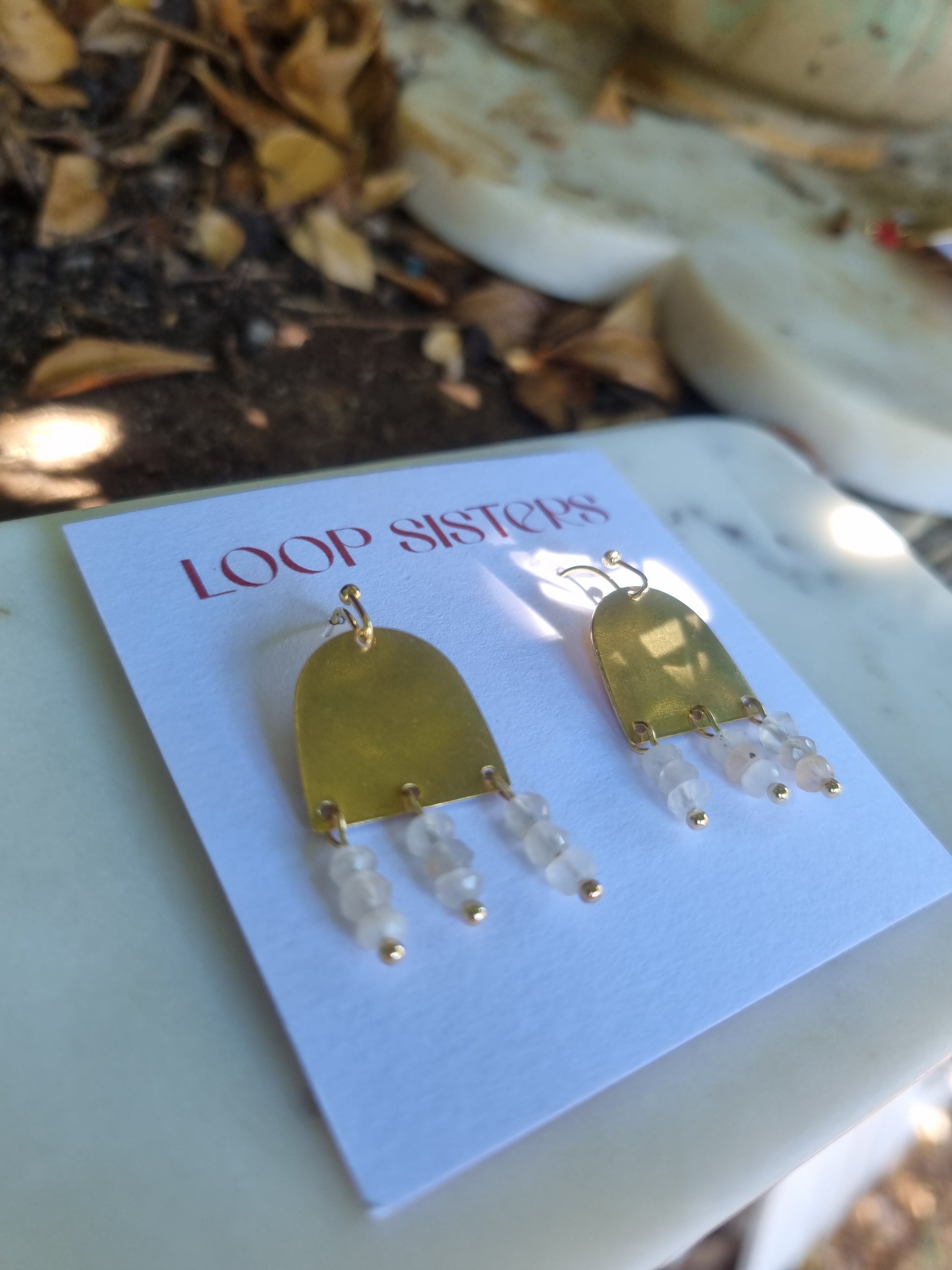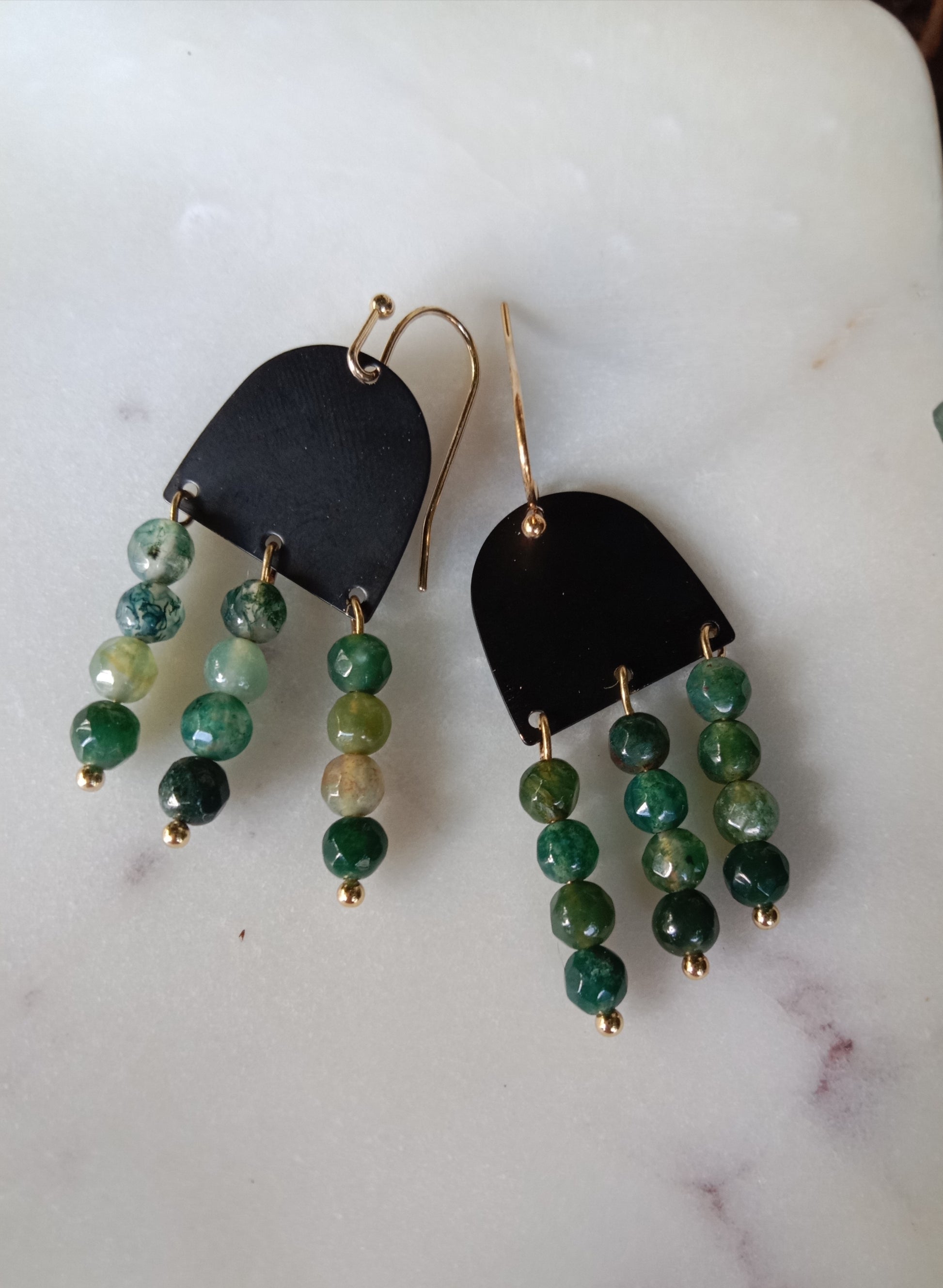 Brass or black arch with a trio drop of semi precious stones.